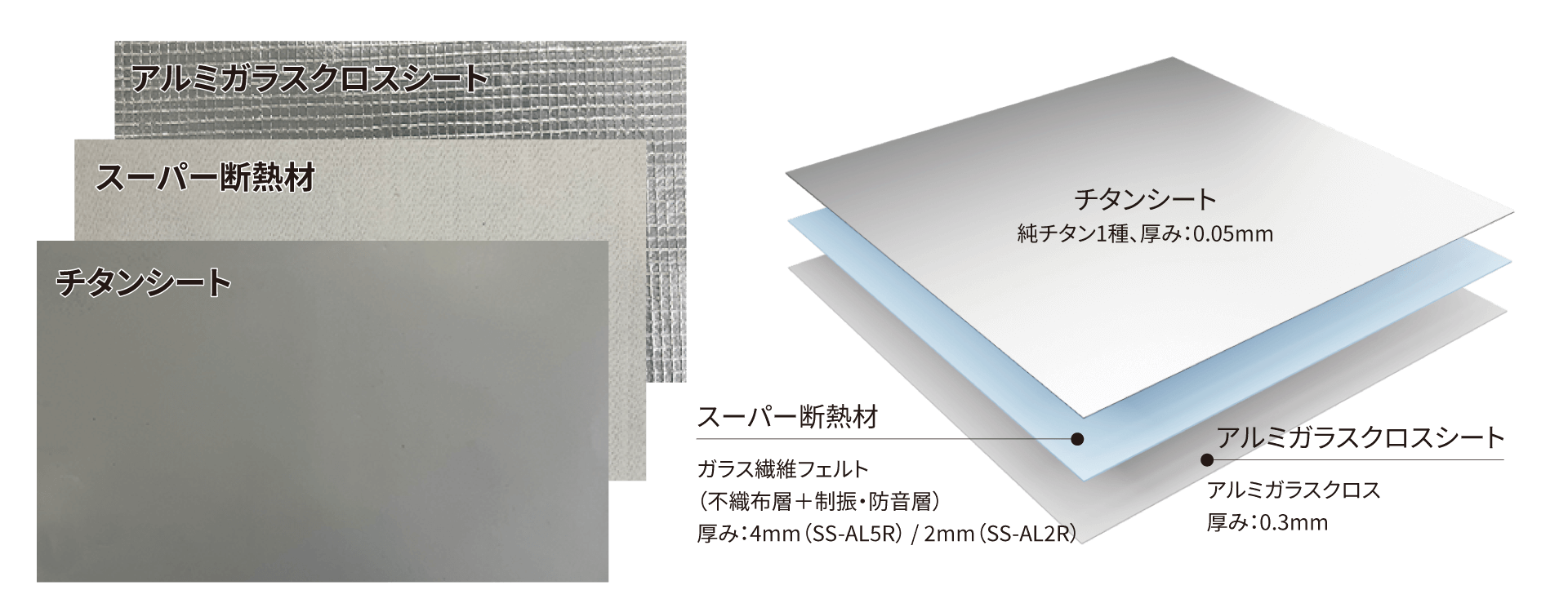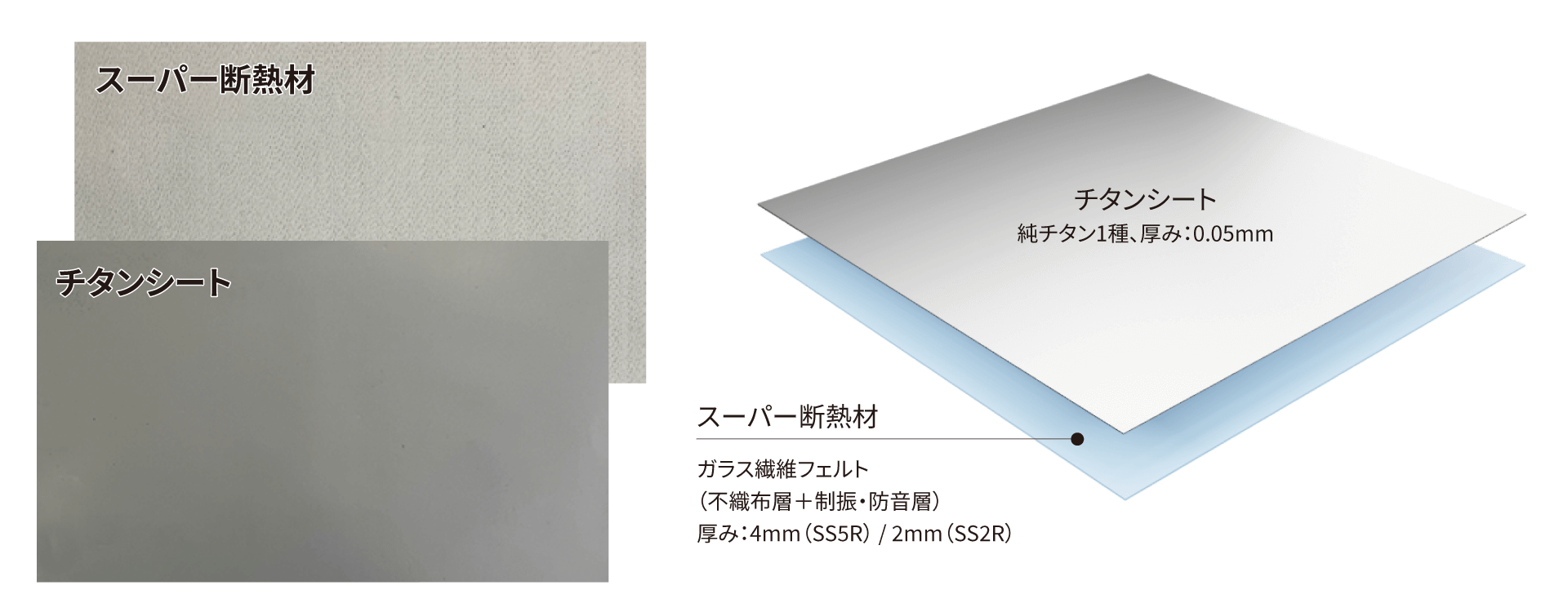 スーパー断熱材が熱や音をカット、さらに表面にチタンシートがあるため、薬品などによる腐食の心配もありません。